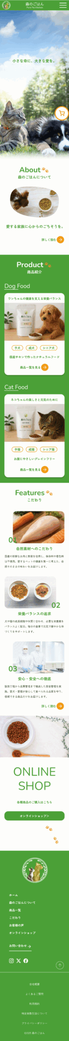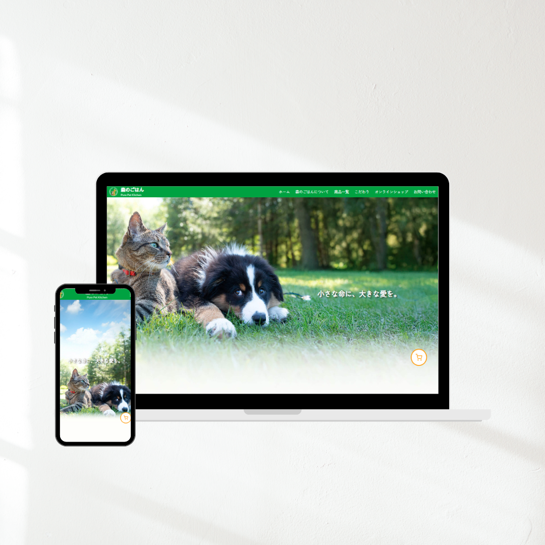 犬、猫向けの無添加ペットフードサイトをテーマに、安心・安全なブランドイメージを大切にしながら、商品の魅力が伝わるデザインを目指しました。 (ターゲットは犬、猫を家族の一員として考える20代~40代の女性で、オンラインショップへの誘導を目的としています)